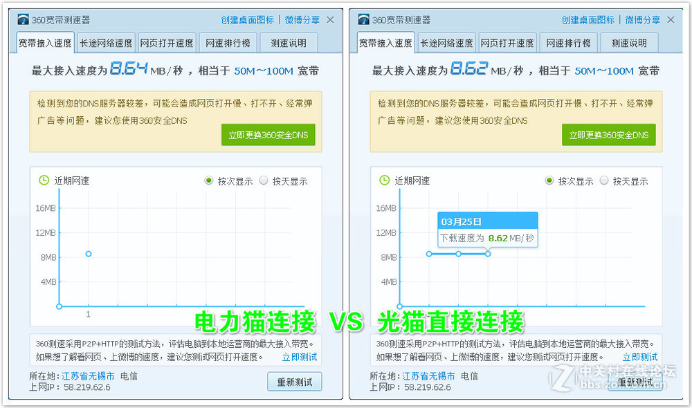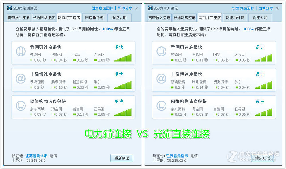 一只电力猫插在光猫上,一只电力猫插在电脑主板网口,自动配对,能够正常上网。网速速度对比如下: