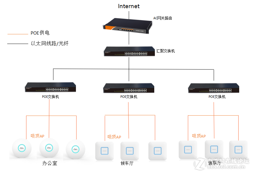 统一管理:无线组网的方式采用COMFAST AC智能网关+双频AP接入,支持无线终端的负载均衡,无缝漫游,数目统计等;无线AP的升级、配置下发、配置修改,都可通过AC网关配合桔子系统OrangeOS进行,方便管理。