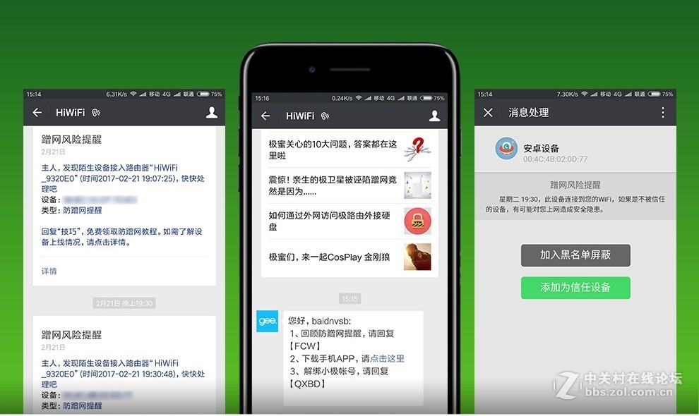 当陌生设备接入时,除手机APP会发出提示外,微信也可以提醒并移除不速之客。