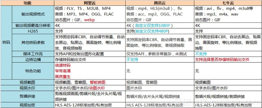 对视频平台而言,有视频采集、编辑、上传、转码、媒资管理、分发、播放众多链路环节。在转码这一环,选择技术实力强大和产品功能丰富的云服务商,可以省去自研的时间和成本,更专注于业务和产品本身的打磨。在选择中,功能完整度是十分重要的考量标准。我们从阿里云、腾讯云、七牛云官网上音视频转码产品页面及相关公开文档中获取了功能信息,如下图所示:
