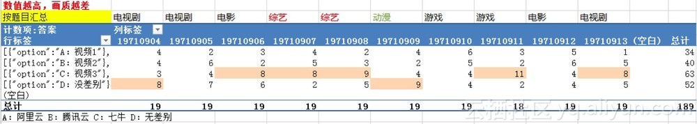 选取转码速度测试中的10组视频,找19个人参与测试,选出主观感受最差的视频,结论如下: