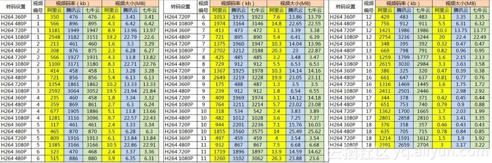 七牛云和腾讯云的码率无差异;阿里云窄带高清转码码率比七牛云、腾讯云码率平均低31.35%,文件大小平均小28.98%。