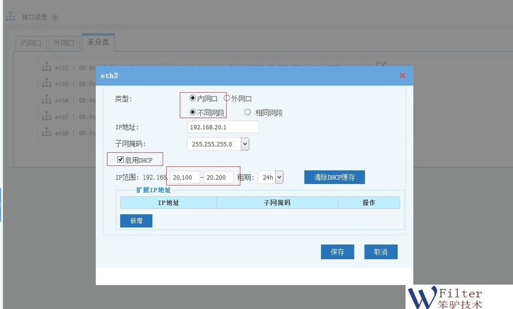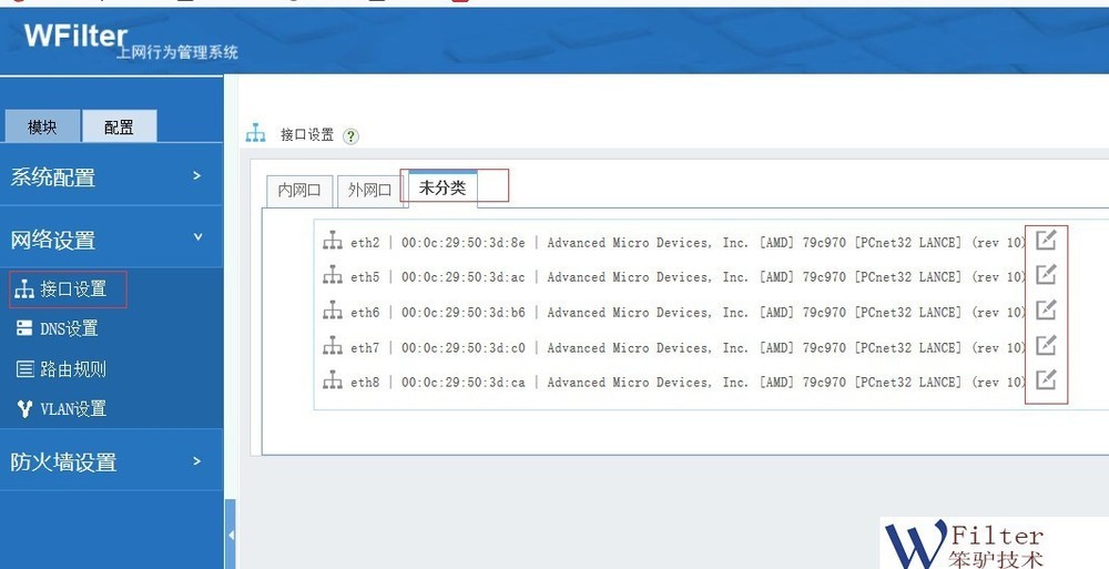 1. 基于端口划分VLAN如图,在“接口设置”的“未分类”中,点击网卡右侧的“编辑”图标,选择“内网”的“不同网段”,即可设置新网段。