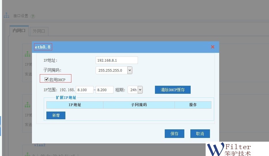 然后到“接口设置”中,编辑新添加的VLAN,设置IP地址和DHCP服务。如图: