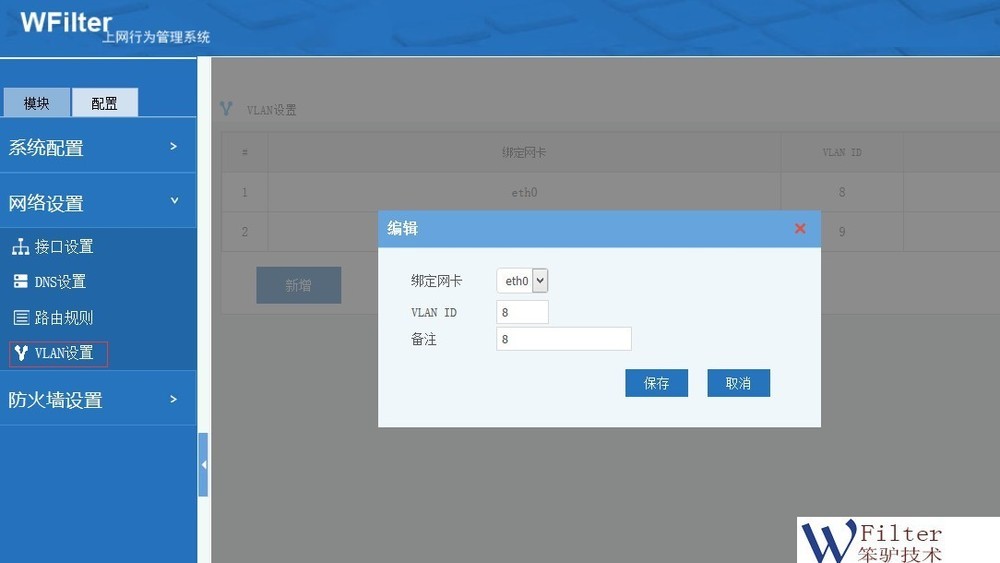 VLAN可以把网络划分成多个广播域,可以有效的控制广播风暴,还可以控制网络中不同部门和网段之间的互相访问。如果您已经有了三层交换机,可以直接在三层交换机上划分VLAN。在没有三层交换机的环境下,您可以直接用WFilter NGF(WSG网关)来划分VLAN。支持两种VLAN的划分方式: