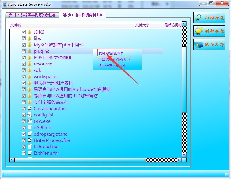 步骤4:将想要恢复的文件勾选,右击选择《复制勾选的文件》,软件会将勾选的文件拷贝出来。