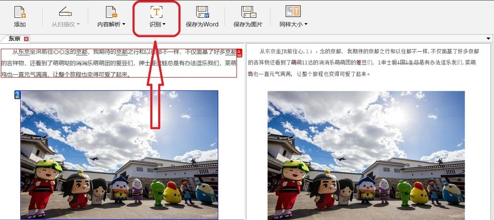 6. 点击软件上方的“识别”按钮,软件就会自动识别图片之中的文字内容,软件所识别的文字是可以修改的,我们可以选中需要修改的文字部分进行修改。