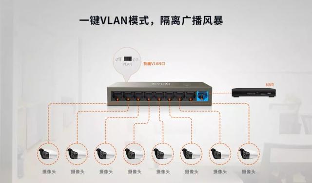 专为中小型安防监控设计,支持一键切换VLAN模式,1-8口相互隔离,9口为千兆上联口。模式开启时,可隔离广播风暴,组织ARP病毒、DHCP欺骗,轻松解决由广播风暴引起的高清监控卡顿、不流畅问题,并提升内网传输速率及安全性。