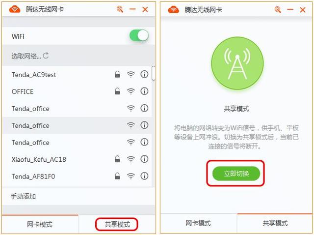 3.驱动安装成功后会出现以下UI界面,点击右下角的“共享模式”,再点击“立即切换”,即可切换至WiFi共享模式。