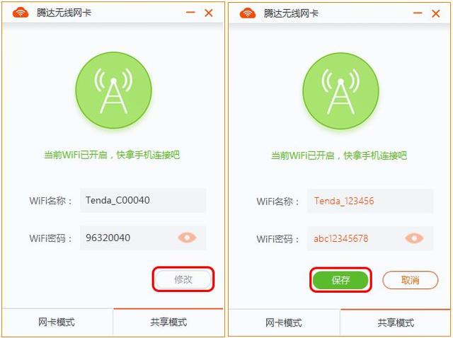 4. 切换成功后,可以看到默认WiFi名称、密码,若要修改WiFi名称、密码,点击 “修改”,修改之后点击“保存”即可。然后手机/平板等设备就可以连接该WiFi上网啦!