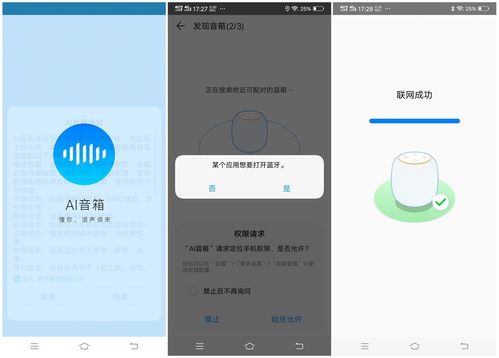华为AI音箱有着强大的AI智能语音交互功能,要想发挥它的专长配合专属的APP“AI音箱”以及互联网是必不可少的环节。下载APP可以通过音箱底部的二维码或者包装上二维码,安装后手机上了,根据提示来进行音箱的联网适配,特别说明一下华为AI音箱仅支持2.4GHz频段的wifi。