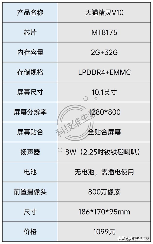 我们先看天猫精灵V10智能音箱的参数。