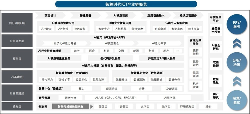 随着AI技术的不断发展,AI智算产业正在成为引领未来发展的重要力量。AI智算产业将会重构传统ICT产业生态,从完整产业链出发,数据作为新的生产要素将会为感知层、基建层、模型层、应用层和服务层的完整环节带来增量需求。