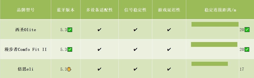 三款都是采用蓝牙5.3版本能支持更高的数据传输速率、但实际户外测试使西圣Olite和漫步者的蓝牙连接会比较稳定,倍思eli在玩游戏的时候出现画面和音效不在一个画面的的现象,会有点延迟。