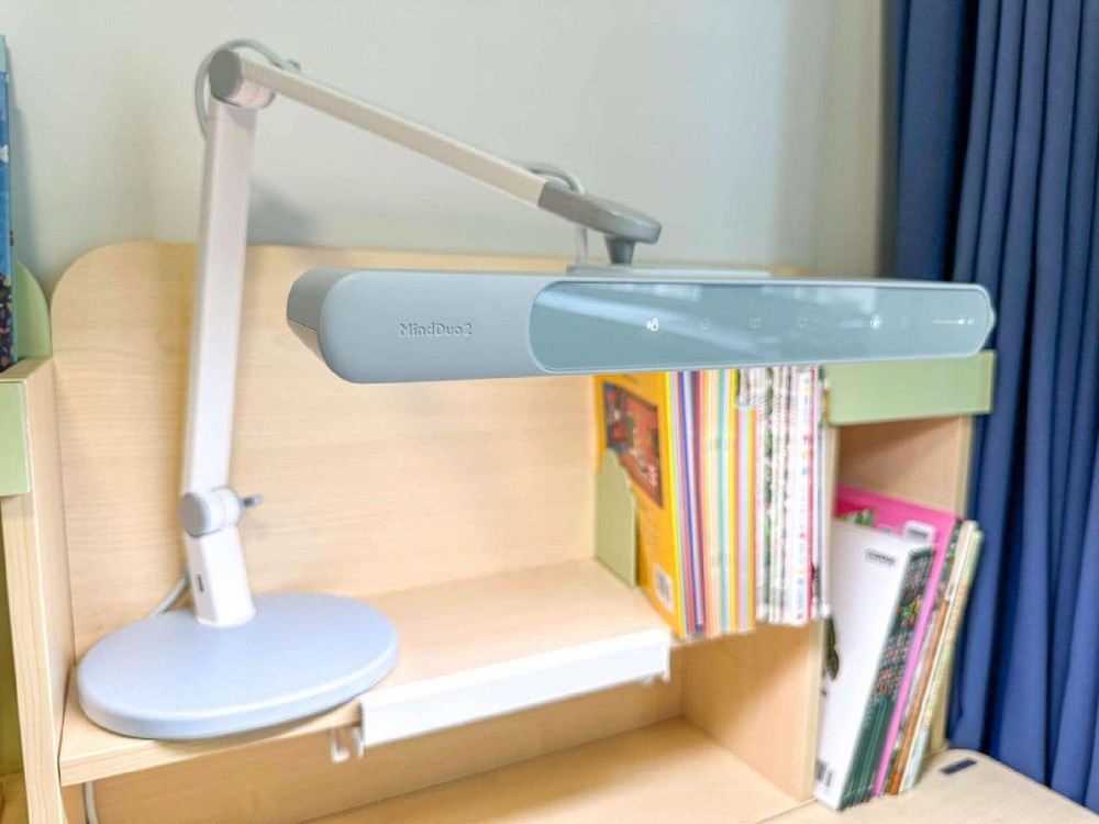 该款台灯是在MindDuo一代的基础上进行重新设计,造型上设计边角无尖角,有效避免孩子磕碰受伤。在灯源设计上采用了全新的前屋檐式隐藏光源设计,光源内沉加上前屋檐对光源的遮挡,减少了直射刺眼的光线。同时设置了30分钟定时提醒功能,功能开启后,每30分钟台灯就会播放铃声提醒孩子休息,保护孩子视力健康。使用下来不方便是是灯头较大较重,即便是碰动桌子,台灯也会晃动。