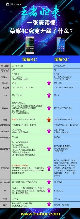 那荣耀3C到荣耀4C如何呢?荣耀4C刚刚发布网间就流传出配置升级的对比图,从下图中我们可以看到,荣耀4C较荣耀3C在配置上有了显著提升,荣耀3C搭载联发科四核CPU,2300mAh容量电池,500万+800万像素摄像头,1GBRAM。荣耀4C则内存提升至2GB,改用自研芯片麒麟620,四核CPU变身八核,500万+1300万像素摄像头,可以说改观十分明显,而最重要的是荣耀4C售价799,只比荣耀3C贵1元钱,一定意义上说是加量不加价,超值,算是真升级!