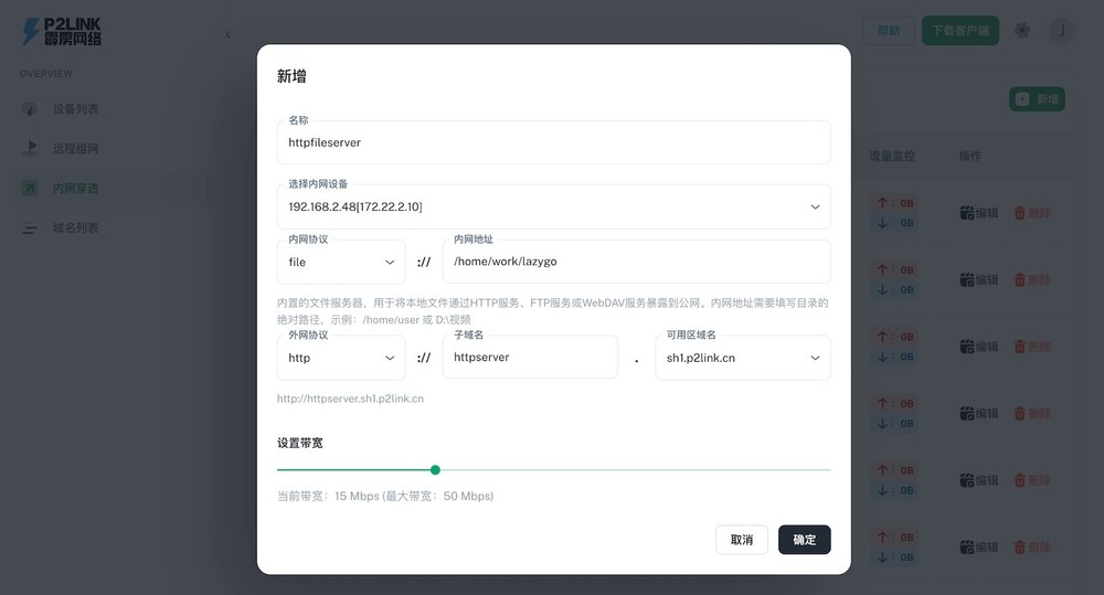 4.内网地址:P2Link内置文件服务的访问目录。填写要通过HTTP共享的文件目录绝对路径。例如Windows系统为 D:视频,或linux系统为/home/p2link/videos